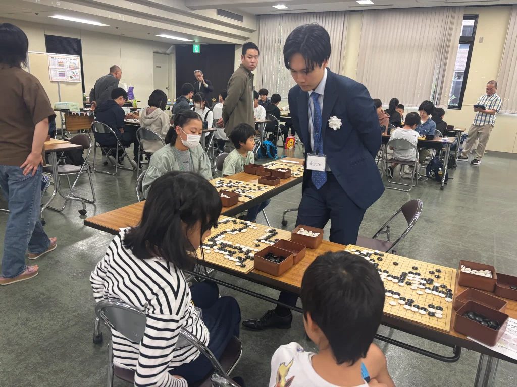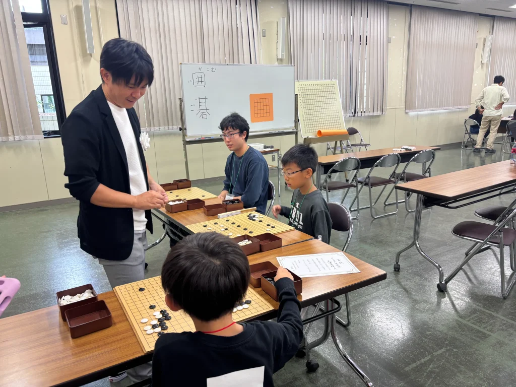 寺田プロ、富山県県代表丸吉さん、福井県県代表長尾さんによる指導碁。午前で対局が終わったA、B、Cクラスの子は午後は指導碁や自由対局、縁日などを楽しみます🎵